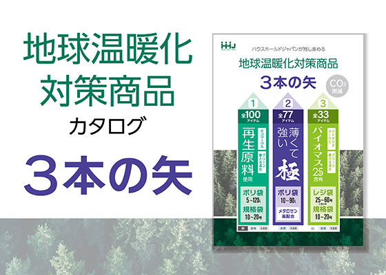 → 再生原料を入れ、CO2排出量を大幅に削減したごみ袋。強度を保ちつつ厚みを約30%落として、ポリエチレン原料の使用量を減らしたポリ袋など。